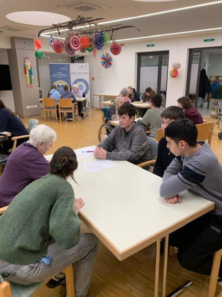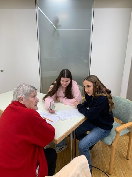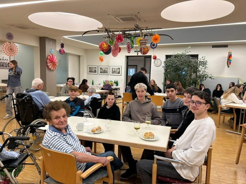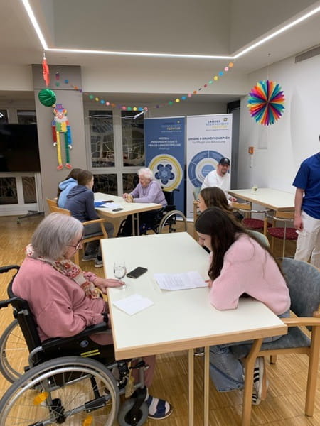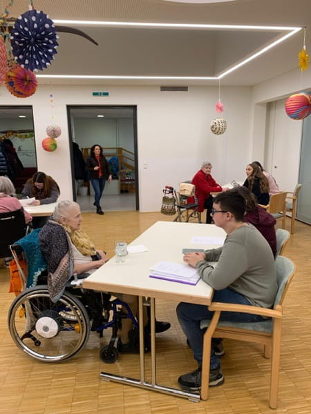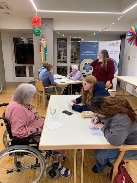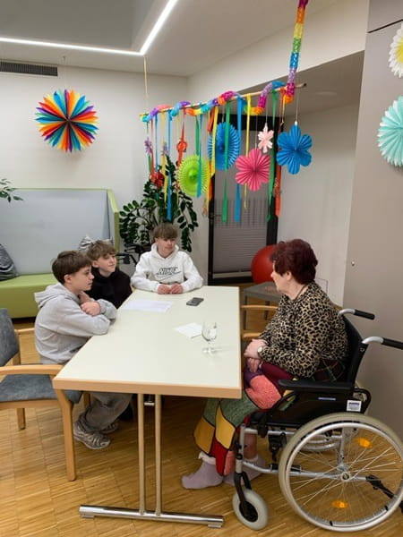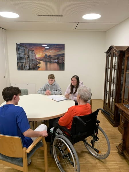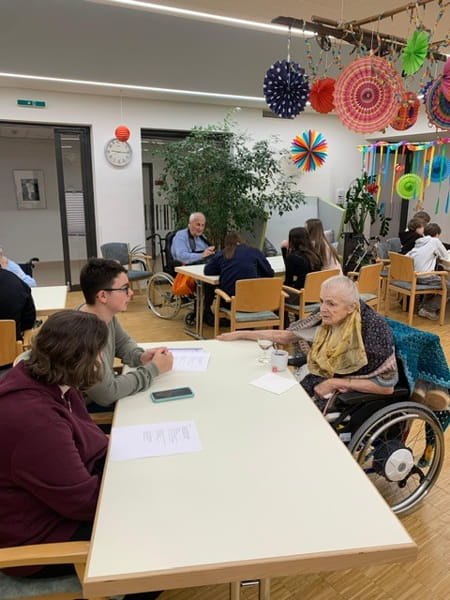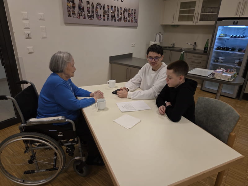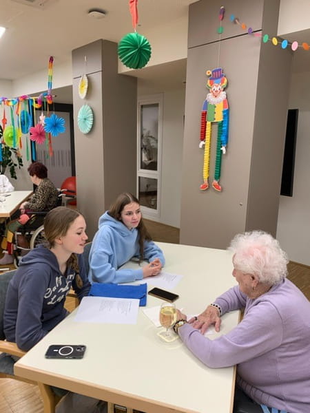 Bereits im Unterricht bestens vorbereitet, bildeten unsere Schülerinnen engagierte Zweierteams und tauchten vor Ort in die bewegenden Lebensgeschichten der Hausbewohner*innen ein. Es wurde interviewt, gelacht, aufmerksam zugehört und fleißig mitgeschrieben. Dabei entstanden nicht nur spannende Gespräche, sondern echte Begegnungen zwischen Generationen – voller Respekt, Wertschätzung und Staunen.
